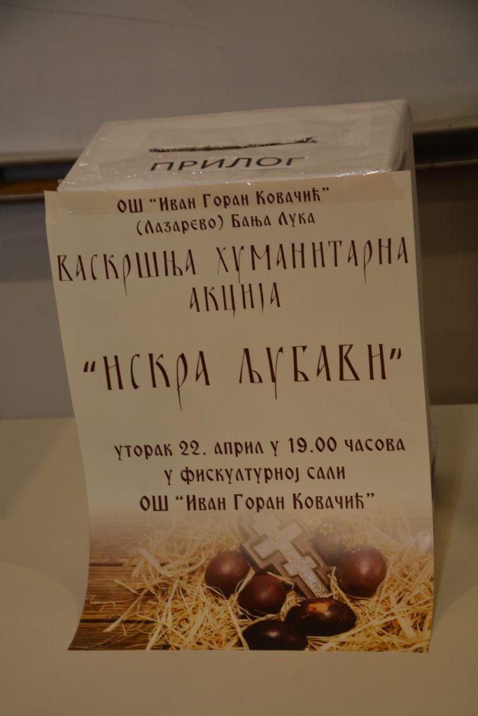 Трећи пут по реду а сада већ традиционална хуманитарна акција „Искра љубави“ ученика и особља ЈУ ОШ „Иван Горан Ковачић“ у Бањој Луци је одржана на Васкрсни уторак 22. 04. 2025. године. Након свечане академије одржана је продајна изложба васкрсних јаја, ликовних радова и уникатних радова разних радионица ученика школе. Сва прикупљена средства ће бити придарена као и предходних година родитељској кући „Искра“ Бања Лука дјеце обољеле од малигних обољења.