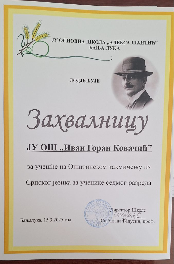 Општинско такмичење из српског језика за ученикe VII разреда оджано је у суботу, 15. 3. 2025. године у ЈУ ОШ „Алекса Шантић“ у Бањој Луци. Нашу школу представљала је Анђела Авдулај VII1 (ментор Нада Рачић).