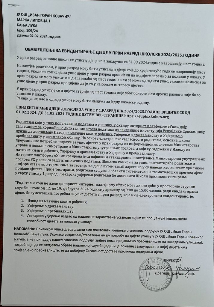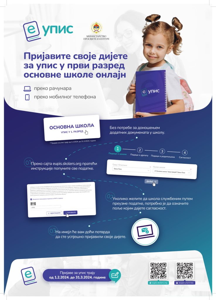 Обавјештавамо Вас да ће пријава дјеце за упис у први разред школске 2024/2025.године путем јавног портала (https://eupis.skolers.org/) бити могућа у периоду од 1. 2. до 31. 3. 2024. године.